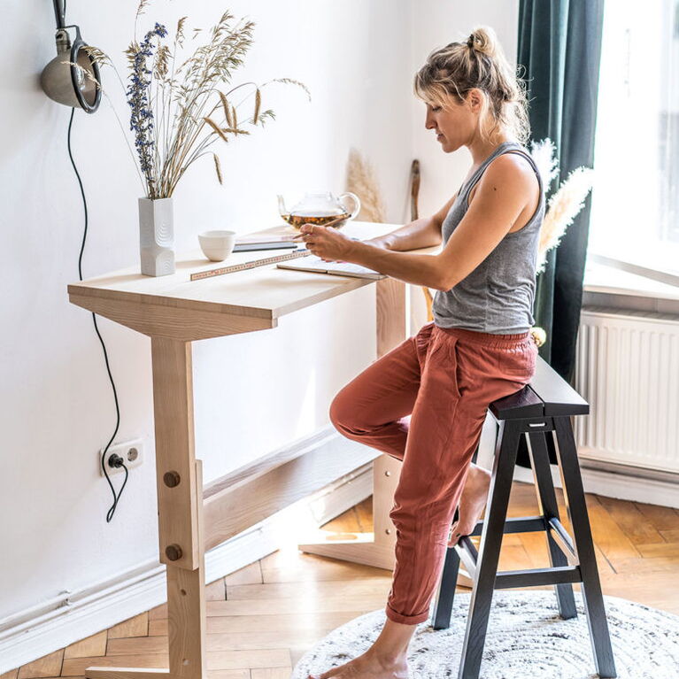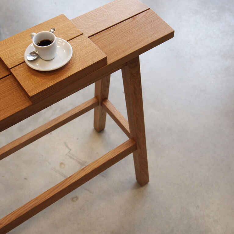 So auch bei der Stehbank „Bock“. In Eiche geölt, Esche schwarz oder Fichte natur kann die schlichte Bank erworben werden.