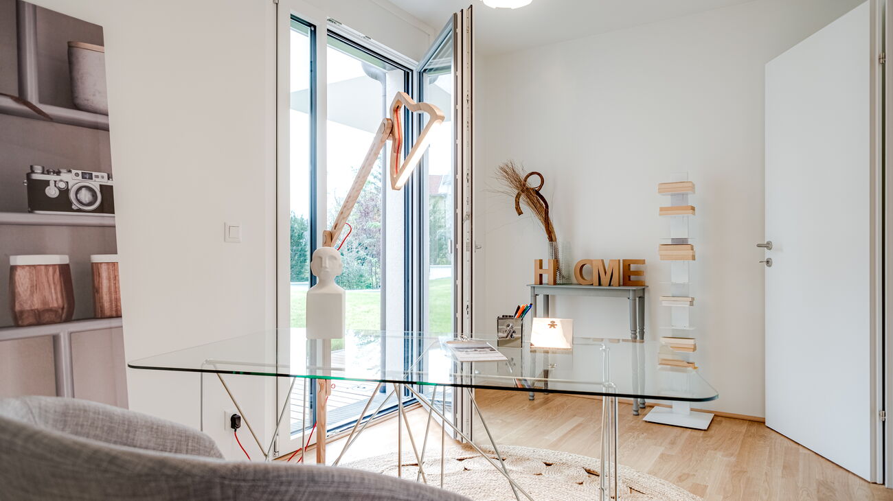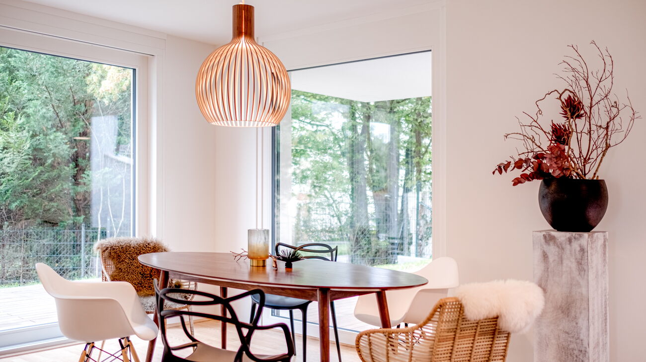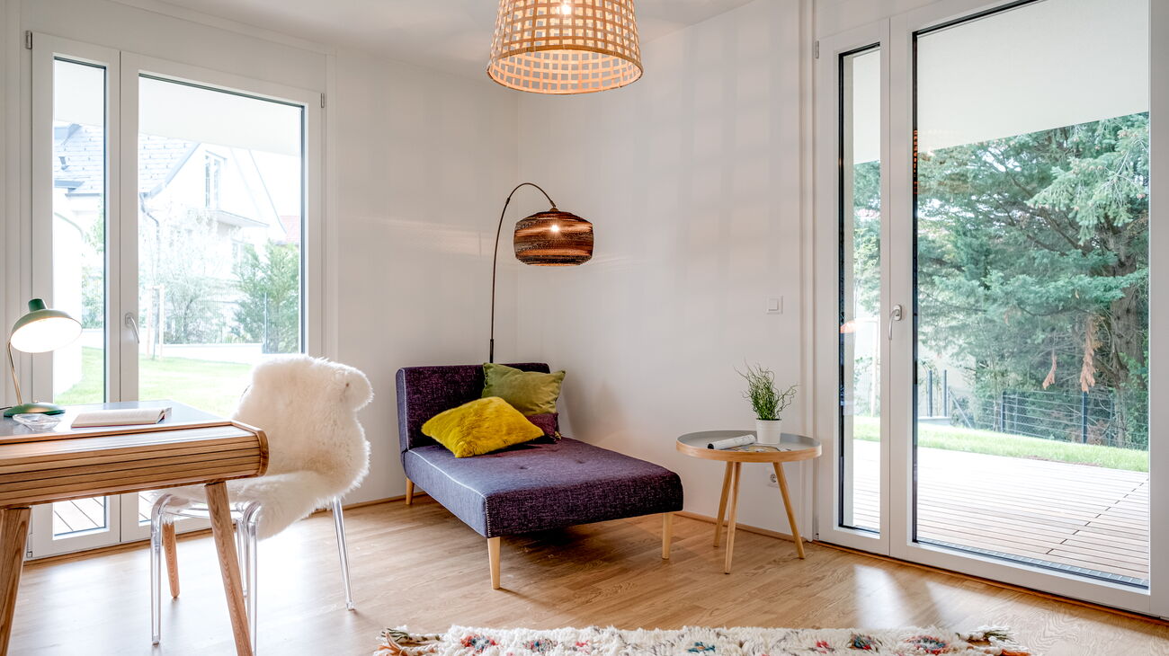 Bei dieser Wohnung war die Beleuchtung besonders wichtig, um Stimmung in die großen Räume zu bringen. Zusätzlich montierten wir einen großen Spiegel, um die Natur noch verstärkt ins Wohnzimmer zu holen. Den kleinen Räumen wurde jeweils eine Funktion zugewiesen – einmal ein Home Office (bei Bedarf auch Gästezimmer), einmal ein Jugendzimmer (oder natürlich auch Gästezimmer).