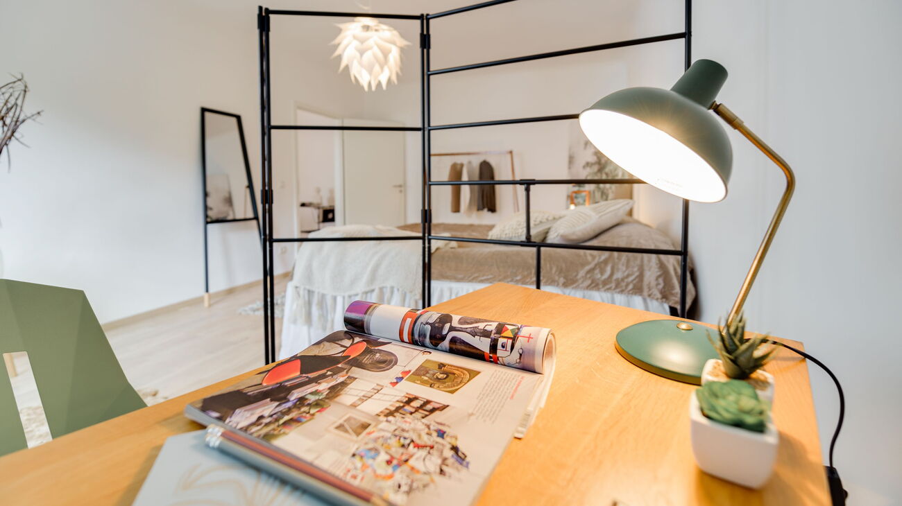 Wie man auf den Bildern sieht, fanden wir sogar im Schlafzimmer noch Platz für ein kleines „Home Office“ – ein weiterer Vorteil zur perfekt sanierten Wohnung.