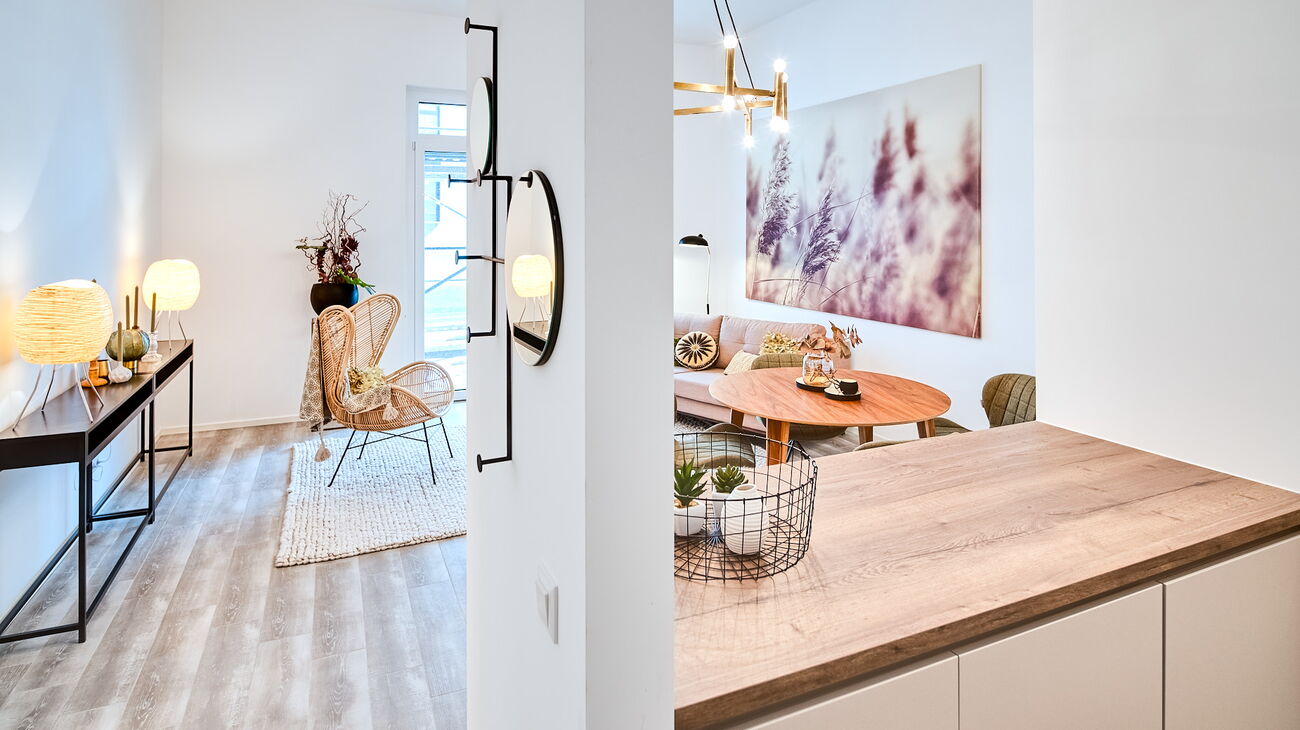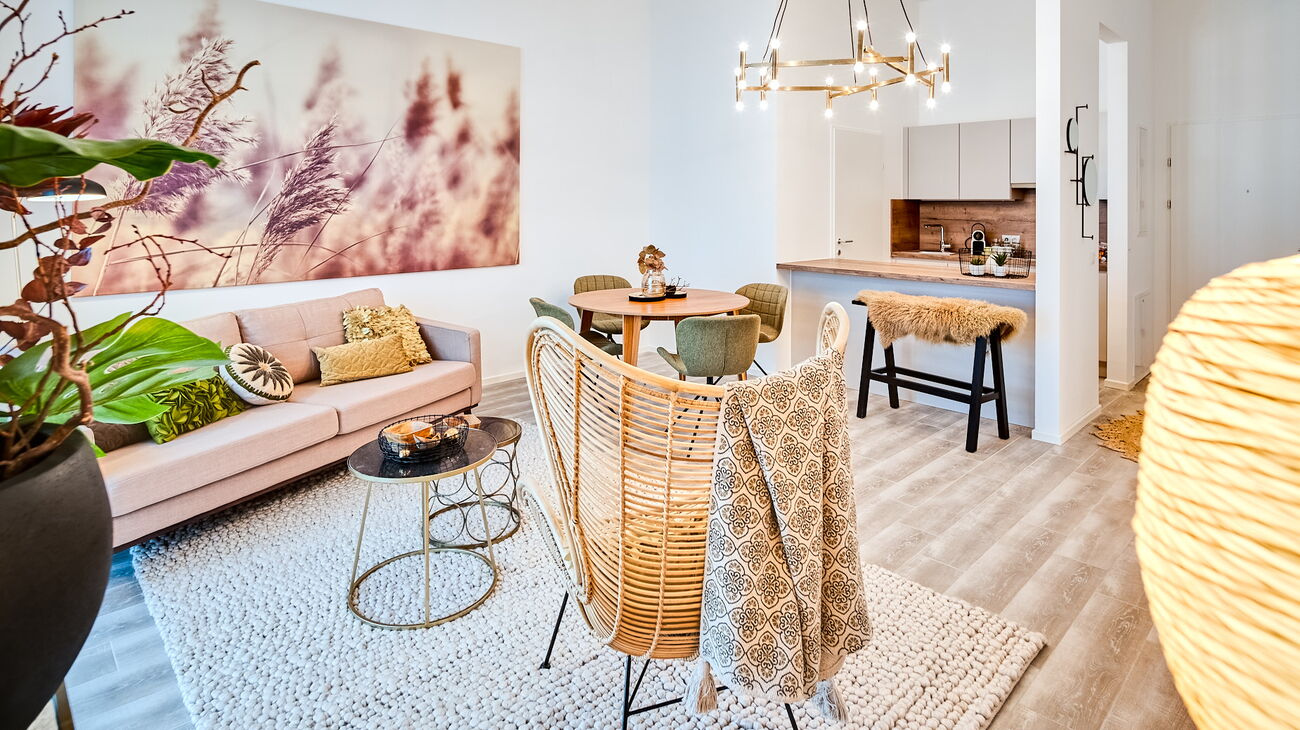 Dieses Neubauprojekt im Sonnwendviertel ist erst Anfang nächsten Jahres für die Mieter bezugsfertig, der Bauträger hat aber die Ausstattung der Musterwohnung vorgezogen, um sie bereits Anfang September gestaged präsentieren zu können. Wichtig war hier das Aufzeigen der Raumfunktionen in kleineren Räumen.