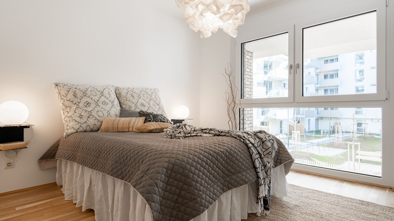 Die Besonderheit hier waren die Fenster bis zum Boden – im leeren Zustand fiel der Blick auf die großen Nachbargebäude. Die möblierte Wohnung macht nicht nur die Räume großzügiger, sondern lenkt den Blick in das Innere der Wohnung – so wie es später auch beim Wohnen sein wird.
