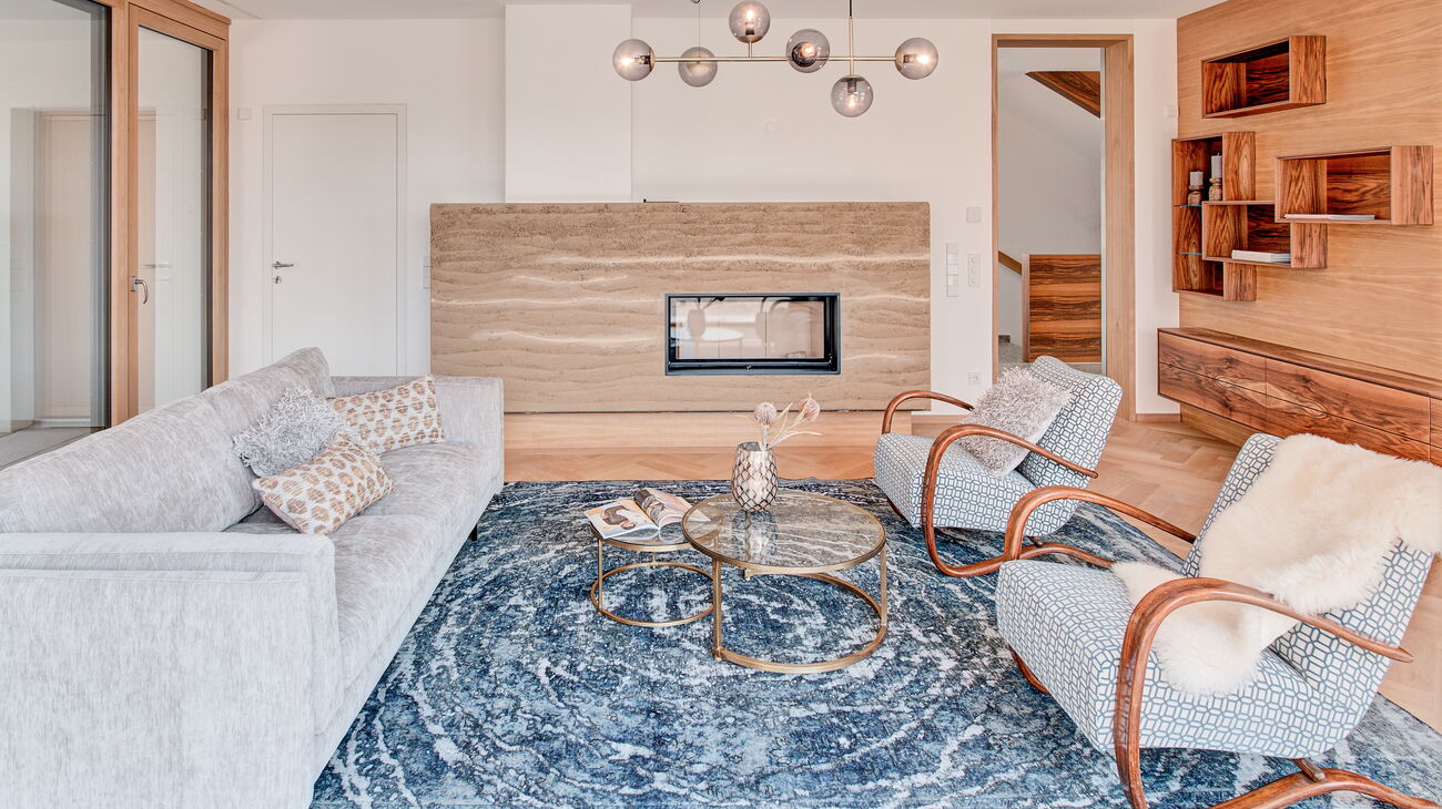 Eine weitere Besonderheit war der großzügige Dachraum mit gemütlicher Lehmwand und schattiger Terrasse. Hier wurden die Funktionen „Chillen“ und „Home Office“ aufgezeigt.
