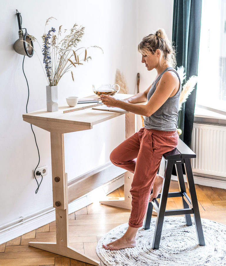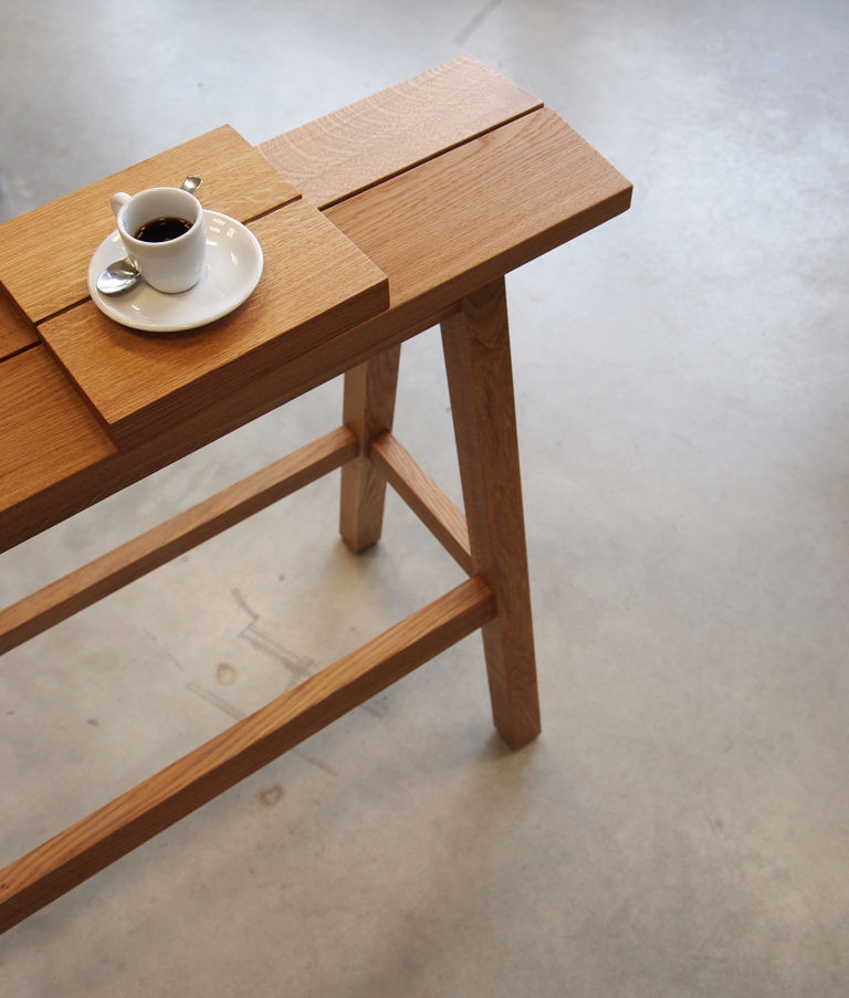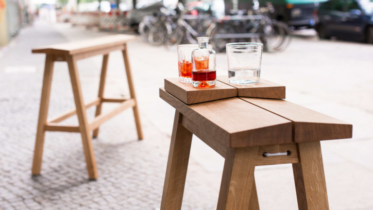 So auch bei der Stehbank „Bock“. In Eiche geölt, Esche schwarz oder Fichte natur kann die schlichte Bank erworben werden.