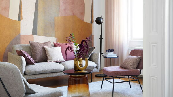 Die aktuelle Sonnhaus-Kollektion passte natürlich perfekt zur Tapete - und die Accessoires der WOHNFEE ergänzten wunderbar das Foto-Setting der Polstermöbel und Kissen.