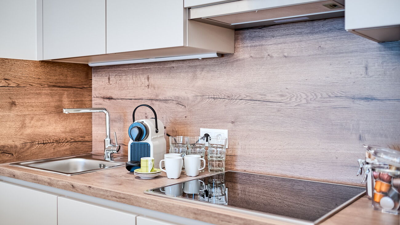 Die vorhandene Küche wurde – wie immer bei der WOHN.FEE – mit Accessoires und einer Nespressomaschine bestückt, damit die Interessenten eine Tasse Kaffee genießen können. Die gesamte Wohnung wurde in Abstimmung mit dem Kunden individuell gestaged – mit einem tollen Luster im Wohnbereich. So haben die Interessenten – trotz Baugerüst – bereits ein echtes Wohn-Feeling! Wichtig war noch die Inszenierung eines kleinen Home Office-Bereichs, der sich in einer Nische zwischen Wohnraum und Schlafzimmer gut einrichten lässt.