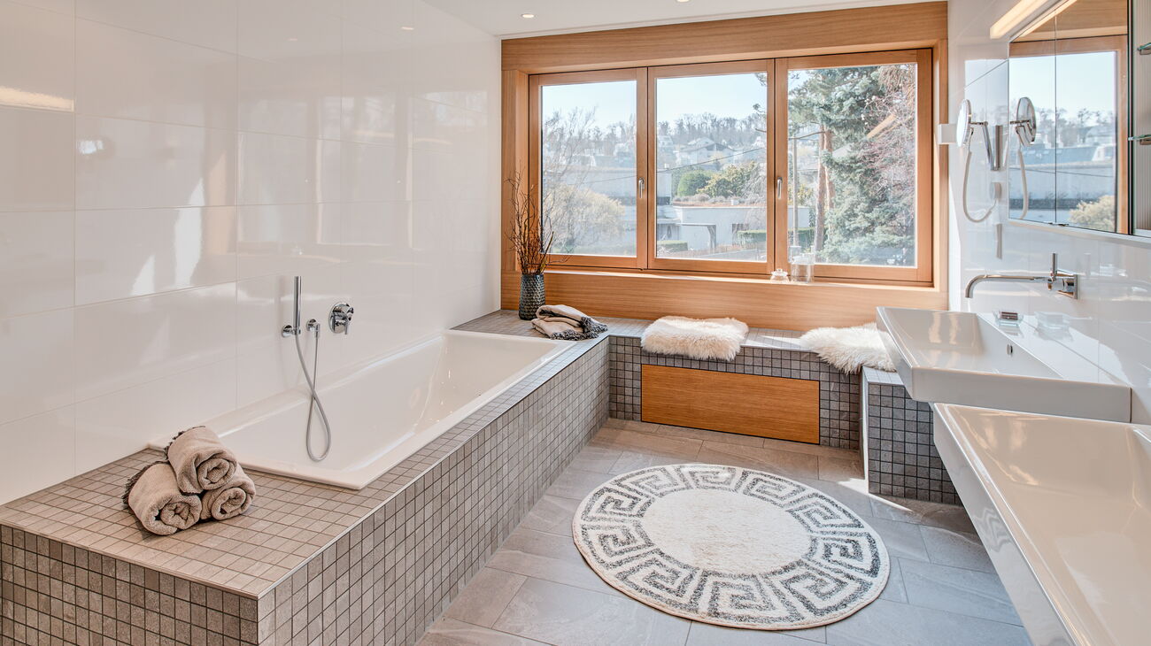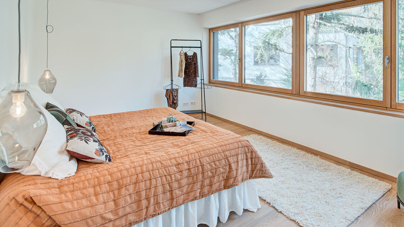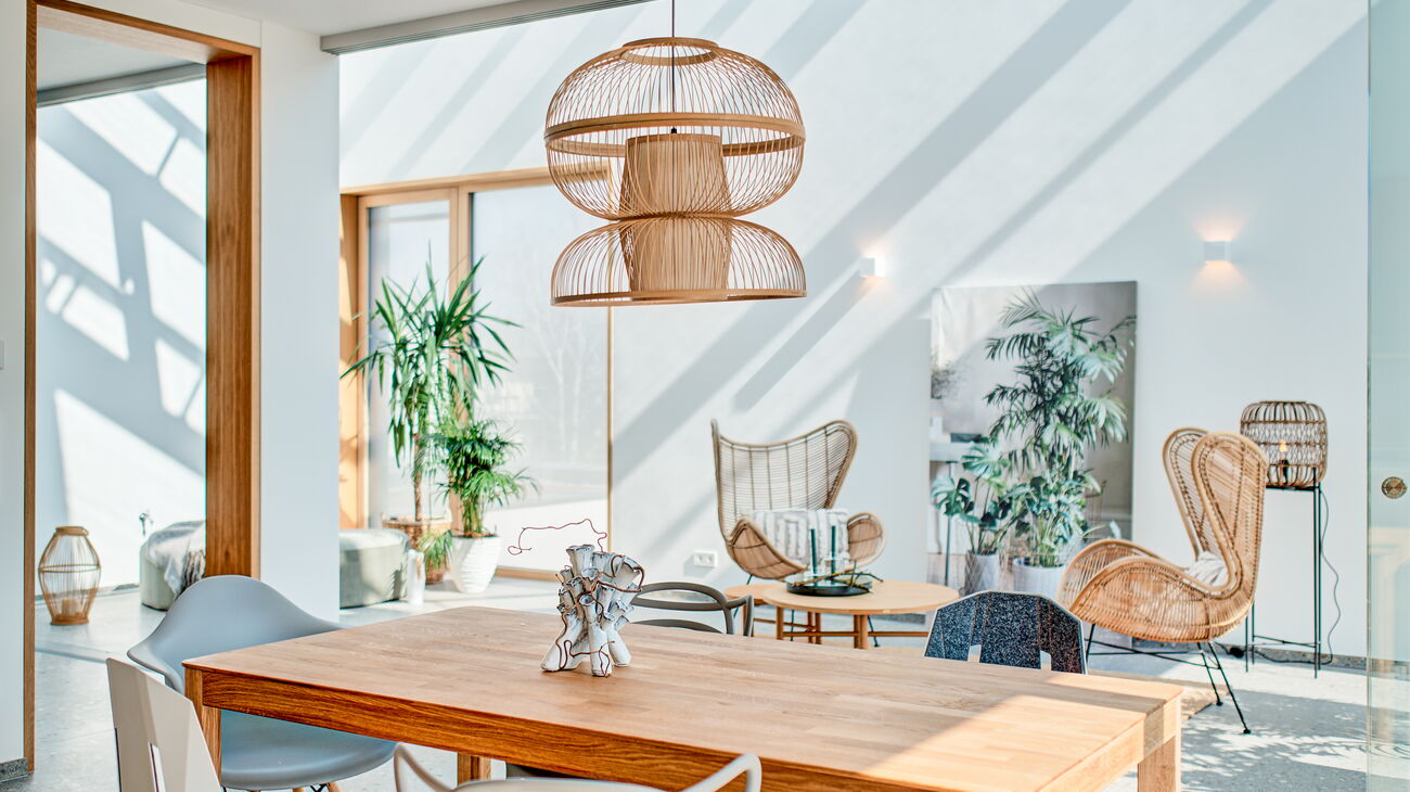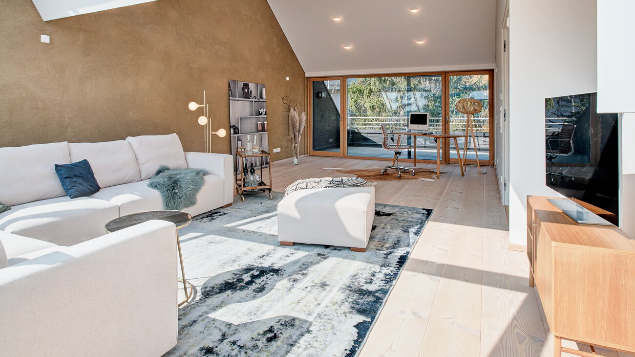 Eine weitere Besonderheit war der großzügige Dachraum mit gemütlicher Lehmwand und schattiger Terrasse. Hier wurden die Funktionen „Chillen“ und „Home Office“ aufgezeigt.